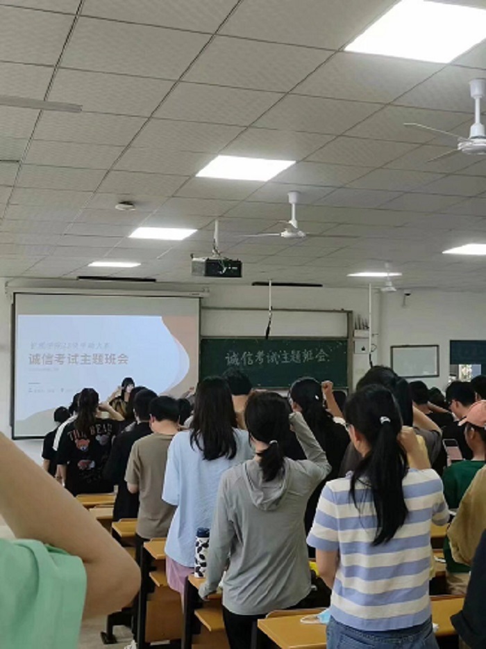 辅导员张丽在班会中特别强调要严格贯彻落实学校有关期末考试的要求,营造良好的考风考纪,端正考试态度,提高广大同学对考试作弊严重性的认识,杜绝考试作弊现象发生,同时从做人做事的角度再次阐述诚信对于同学们今后发展的重要性,鼓励同学们努力学习考出自己的水平。随后团总支书记褚文慧带领全体同学进行诚信考试宣誓。通过主题班会教育,同学们纷纷表示作为新时代的大学生,应该自觉遵守学校的规章制度,恪守诚信,不抄袭、不剽窃、不作弊,同时还要注重个人品德修养,做一个有担当、有责任心的新时代青年。